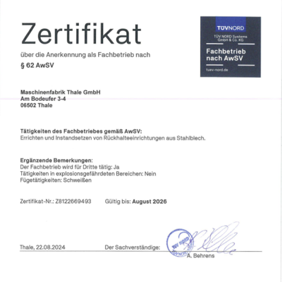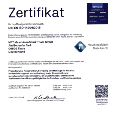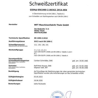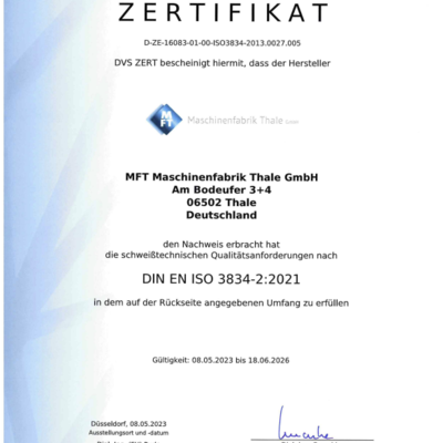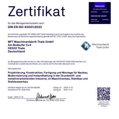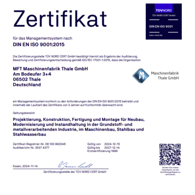 Qualität ist Herausforderung und Markenzeichen der MFT Maschinenfabrik GmbH. Ein Meilenstein auf diesem Weg sind die Zertifizierungen vorwiegend durch den TÜV Nord und die laufenden Mitarbeiterqualifizierungen.